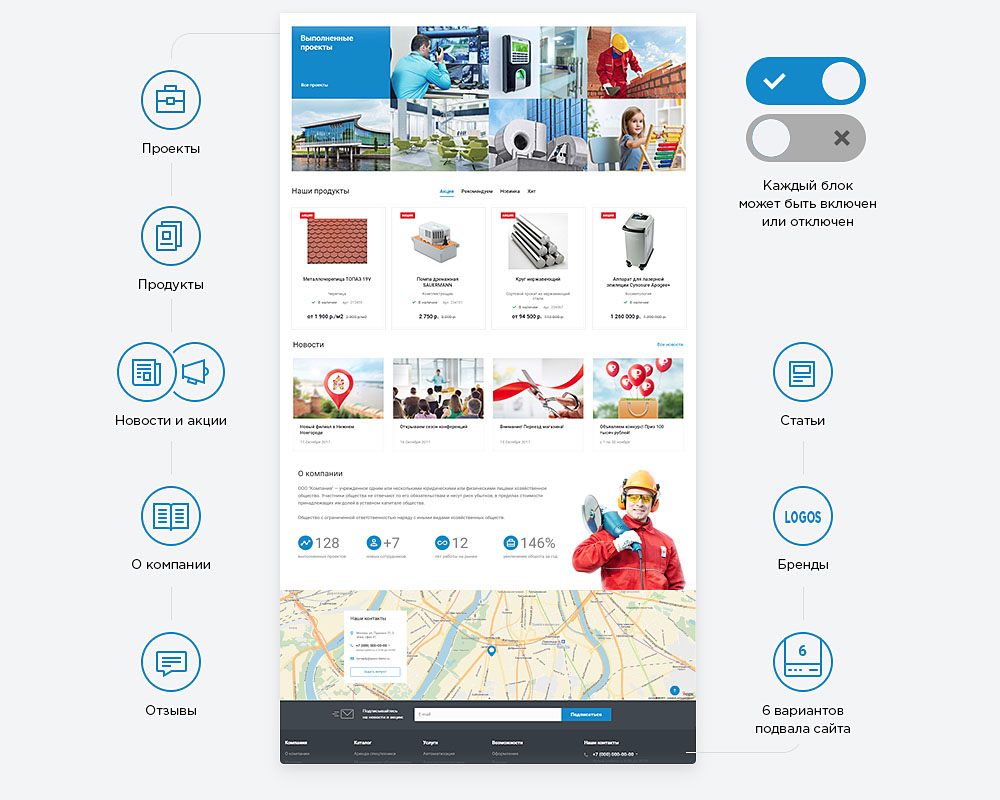 Все составляющие вашего сайта – акции, товары, услуги, отзывы, проекты