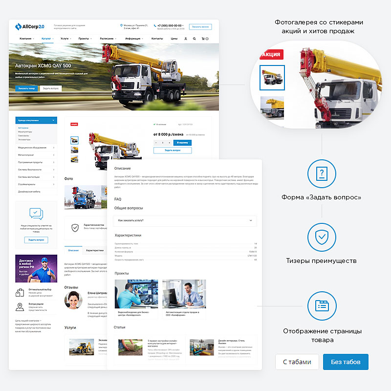 • 7 вкладок для информации о товаре: тарифы, описание, фотогалерея, реализованные проекты, характеристики, документы, FAQ
