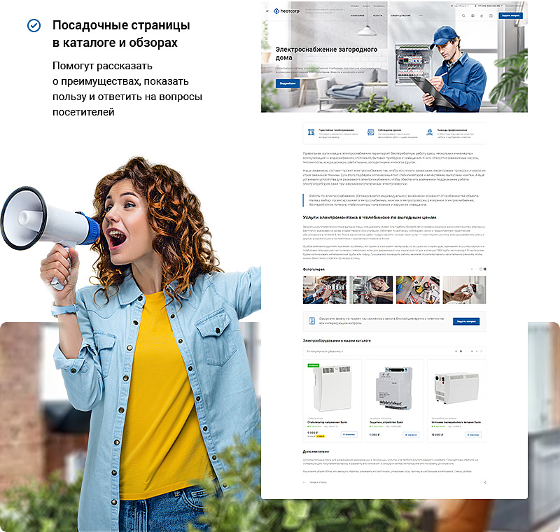 Добавляйте посадочные страницы в каталоге, обзорах и услугах, чтобы рассказать о преимуществах, сформировать доверие пользователей и ответить на часто задаваемые вопросы.